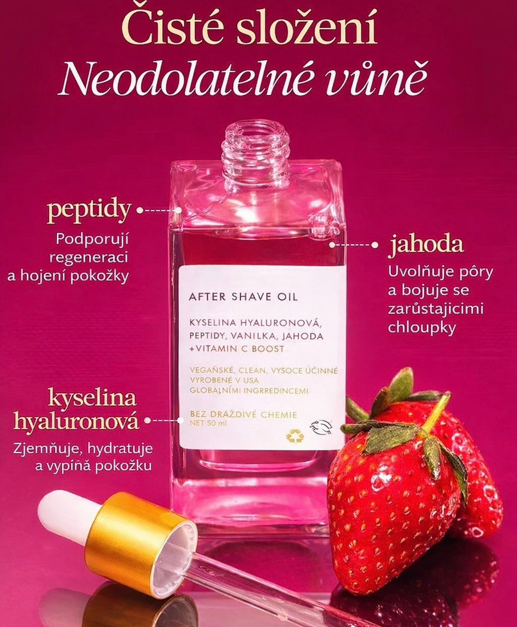 Extrakt z jahod: bohatý na přírodní AHA, jemně exfoliuje, odstraňuje odumřelé buňky a pomáhá udržovat pleť jasnou a rovnoměrnou.